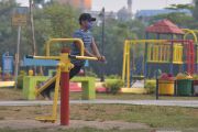 Seorang warga berolahraga mengenakan masker medis di tengah asap kebakaran hutan dan lahan di Kota Pekanbaru, Senin (5/8/2019). Asap akibat kebakaran hutan dan lahan (karhutla) sudah seminggu terakhir menyelimuti Pekanbaru, membuat kualitas udara turun dari status sehat menjadi sedang, akibat karhutla di Riau yang terus meluas. ANTARA FOTO/FB Anggoro/hp.