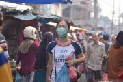 Seorang warga mengenakan masker medis di tengah asap kebakaran hutan dan lahan di Kota Pekanbaru, Senin (5/8/2019). Asap akibat kebakaran hutan dan lahan (karhutla) sudah seminggu terakhir menyelimuti Pekanbaru, membuat kualitas udara turun dari status sehat menjadi sedang, akibat karhutla di Riau yang terus meluas. ANTARA FOTO/FB Anggoro/hp.