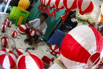Perajin menyelesaikan pesanan lampion merah putih di Istana Lampion Solo, Jawa Tengah, Senin (5/8/2019). Lampion yang dijual seharga Rp10 ribu hingga Rp40 ribu per buah tergantung ukuran tersebut banyak dipesan untuk perayaan HUT ke-74 RI pada 17 Agustus 2019 mendatang. ANTARA FOTO/Maulana Surya/wsj.