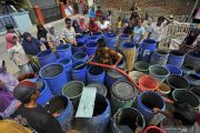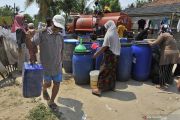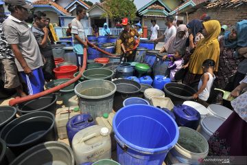 Sejumlah warga mengambil air bersih yang dibagikan secara gratis dari mobil tanki BPBD (Badan Penanggulangan Bencana Daerah) Kabupaten Serang di Kampung Kesabilan, Pontang, Serang, Banten, Rabu (7/8/2019). Berdasarkan data BPBD Provinsi Banten sebanyak 37 Kecamatan yang tersebar di 8 wilayah Kota/Kabupaten mengalami krisis air bersih akibat kemarau tahun ini. ANTARA FOTO/Asep Fathulrahman/hp.
