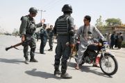 Petugas kepolisian Afghanistan berjaga di sekitar lokasi kejadian bom mobil meledak di Kota Kabul, Afghanistan, Rabu (7/8/2019). Taliban mengklaim bertanggung jawab atas bom mobil bunuh diri yang menyerang sebuah pos polisi di Kabul, yang menurut informasi dari aparat pemerintah menyebabkan 14 orang tewas dan 145 orang lainnya luka-luka. ANTARA FOTO/REUTERS/Omar Sobhani/wsj.