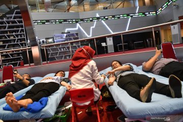 Sejumlah karyawan melakukan donor darah dengan latar belakang pergerakan indeks harga saham gabungan (IHSG) di gedung Bursa Efek Indonesia, Jakarta, Rabu (7/8/2109). Perdagangan IHSG ditutup menguat 84,72 poin atau 1,38 persen ke posisi 6.204,2. ANTARA FOTO/Sigid Kurniawan/wsj.