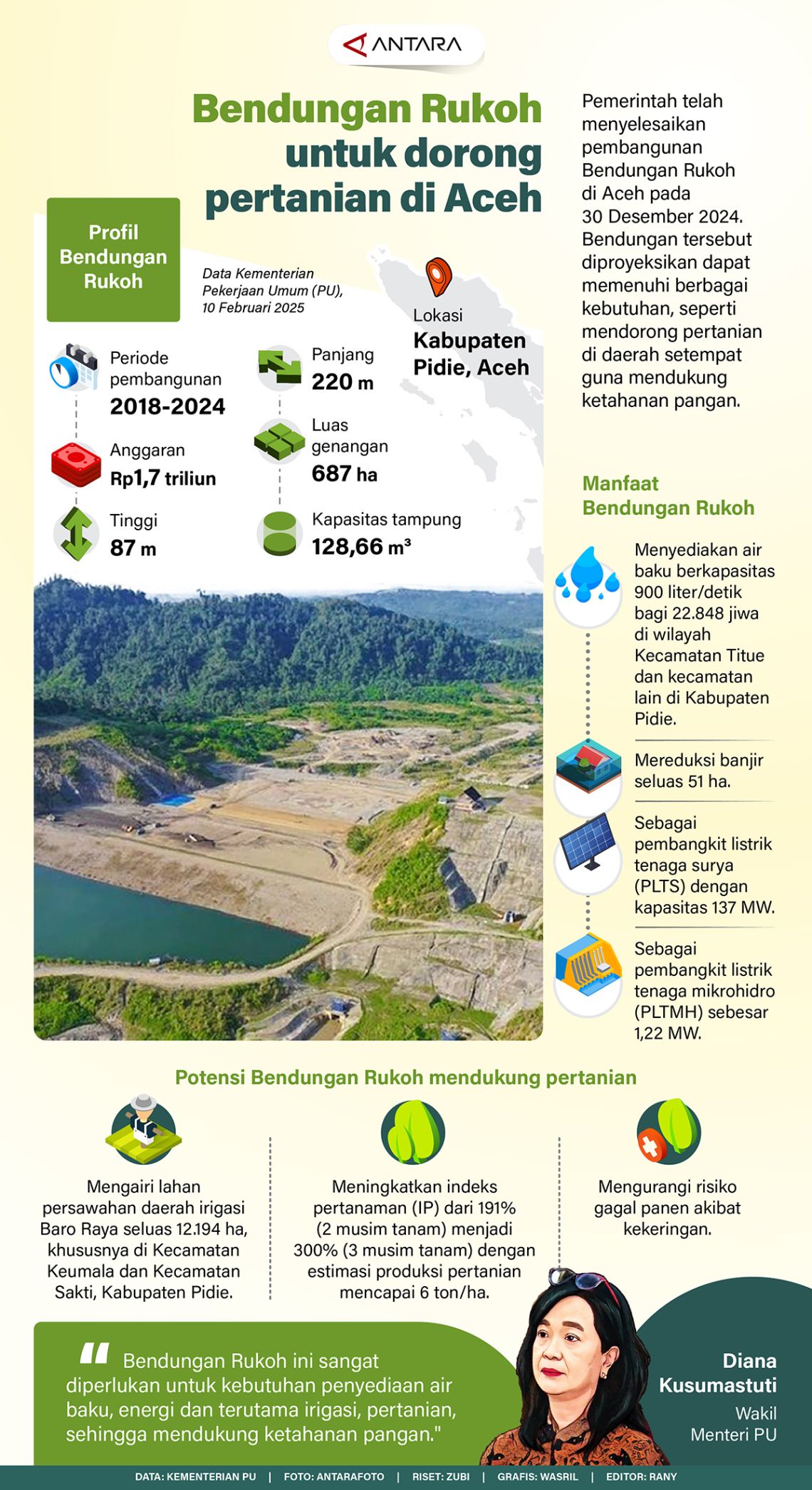 Pemerintah telah menyelesaikan pembangunan Bendungan Rukoh di Aceh pada 8 Februari 2025. Bendungan tersebut diproyeksikan dapat memenuhi berbagai kebutuhan, seperti mendorong pertanian di daerah setempat guna mendukung ketahanan pangan.