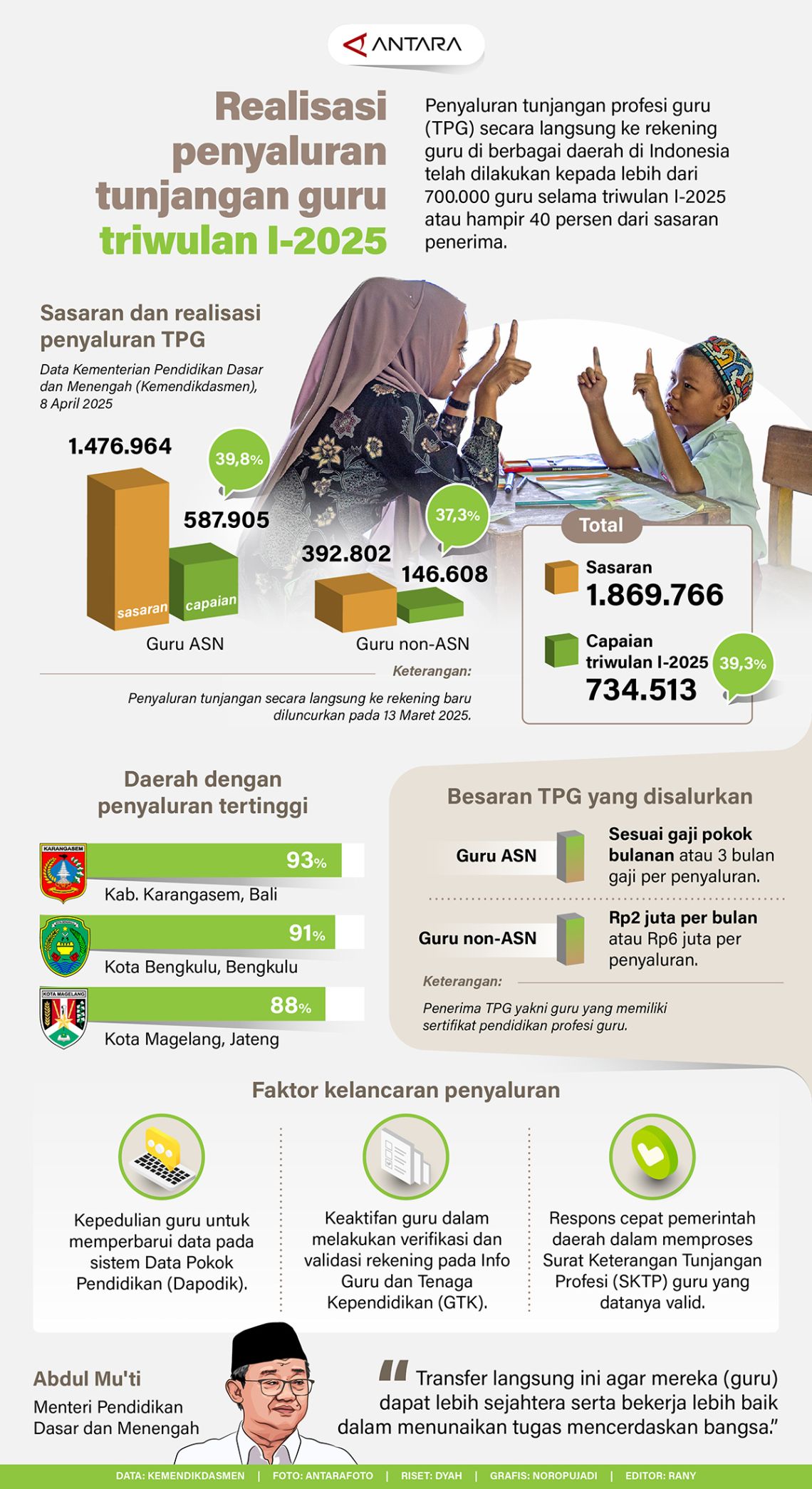 Penyaluran tunjangan profesi guru (TPG) secara langsung ke rekening guru di berbagai daerah di Indonesia telah dilakukan kepada lebih dari 700.000 orang selama triwulan I-2025 atau hampir 40 persen dari sasaran penerima 2025.
