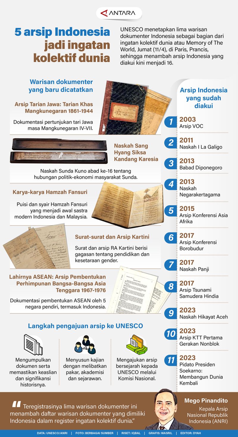 UNESCO menetapkan lima warisan dokumenter Indonesia sebagai bagian dari ingatan kolektif dunia atau Memory of The World, Jumat (11/4), di Paris, Prancis, sehingga menambah arsip Indonesia yang diakui kini menjadi 16.