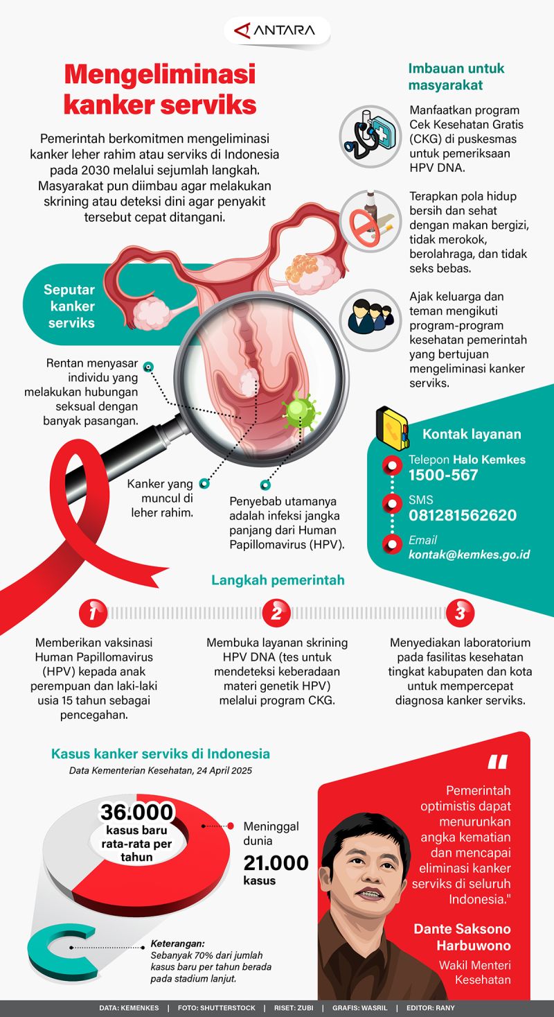 Pemerintah berkomitmen mengeliminasi kanker leher rahim atau serviks di Indonesia pada 2030 melalui sejumlah langkah strategis. Masyarakat pun diimbau agar melakukan skrining atau deteksi dini agar penyakit tersebut cepat ditangani.