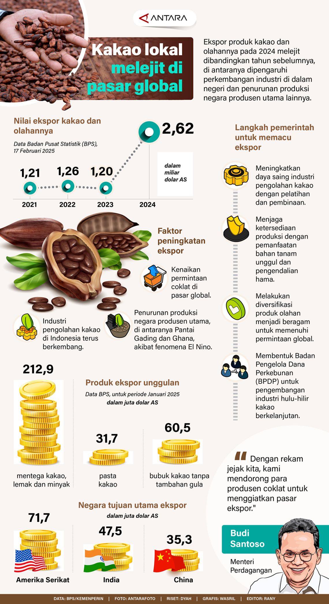 Ekspor produk kakao dan olahannya pada 2024 melejit dibandingkan tahun-tahun sebelumnya, di antaranya dipengaruhi perkembangan industri di dalam negeri dan penurunan produksi negara produsen utama lainnya.