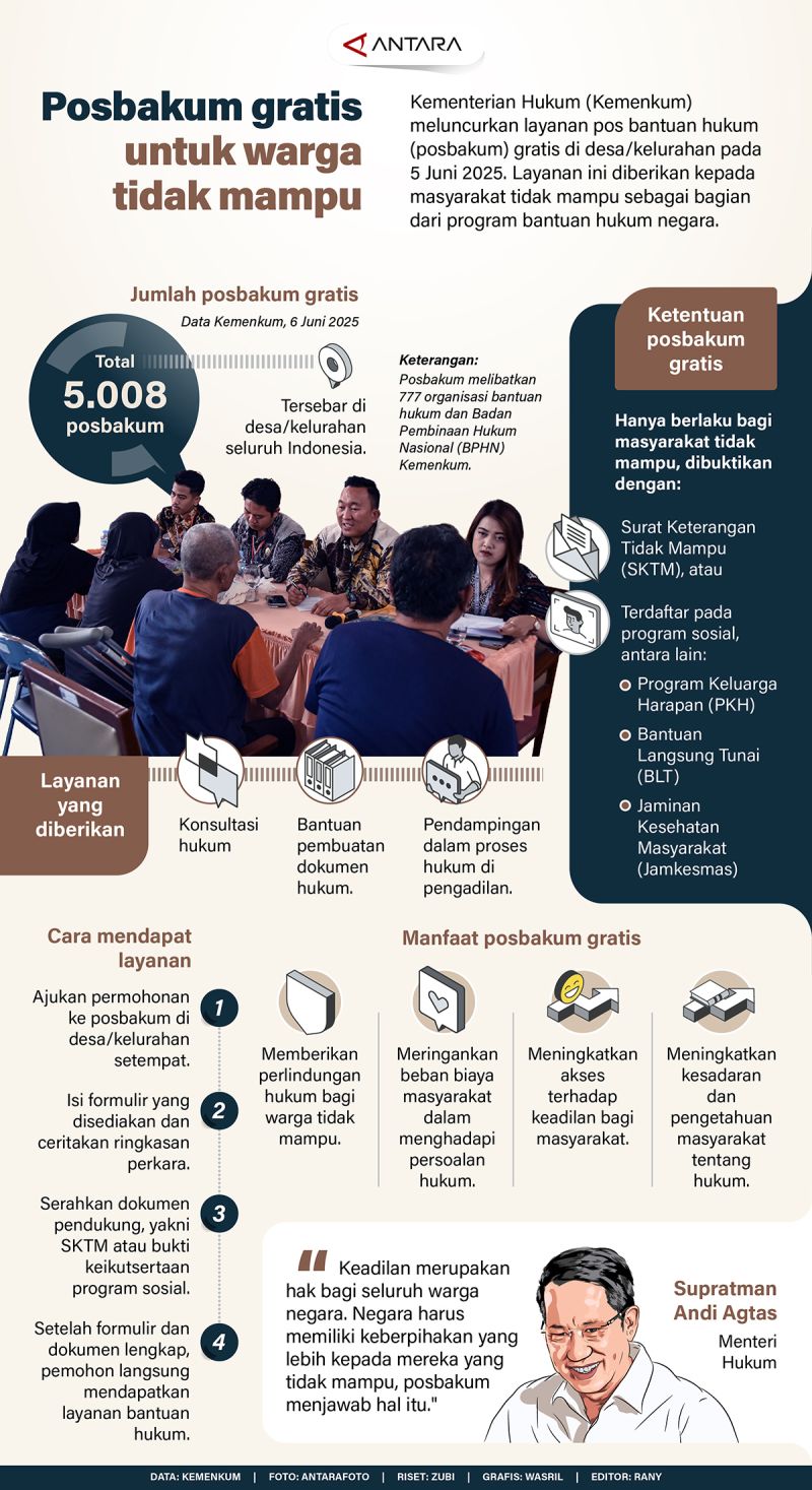 Kementerian Hukum (Kemenkum) meluncurkan layanan pos bantuan hukum (posbakum) gratis di desa/kelurahan pada 5 Juni 2025. Layanan ini diberikan kepada masyarakat tidak mampu sebagai bagian dari program bantuan hukum negara.