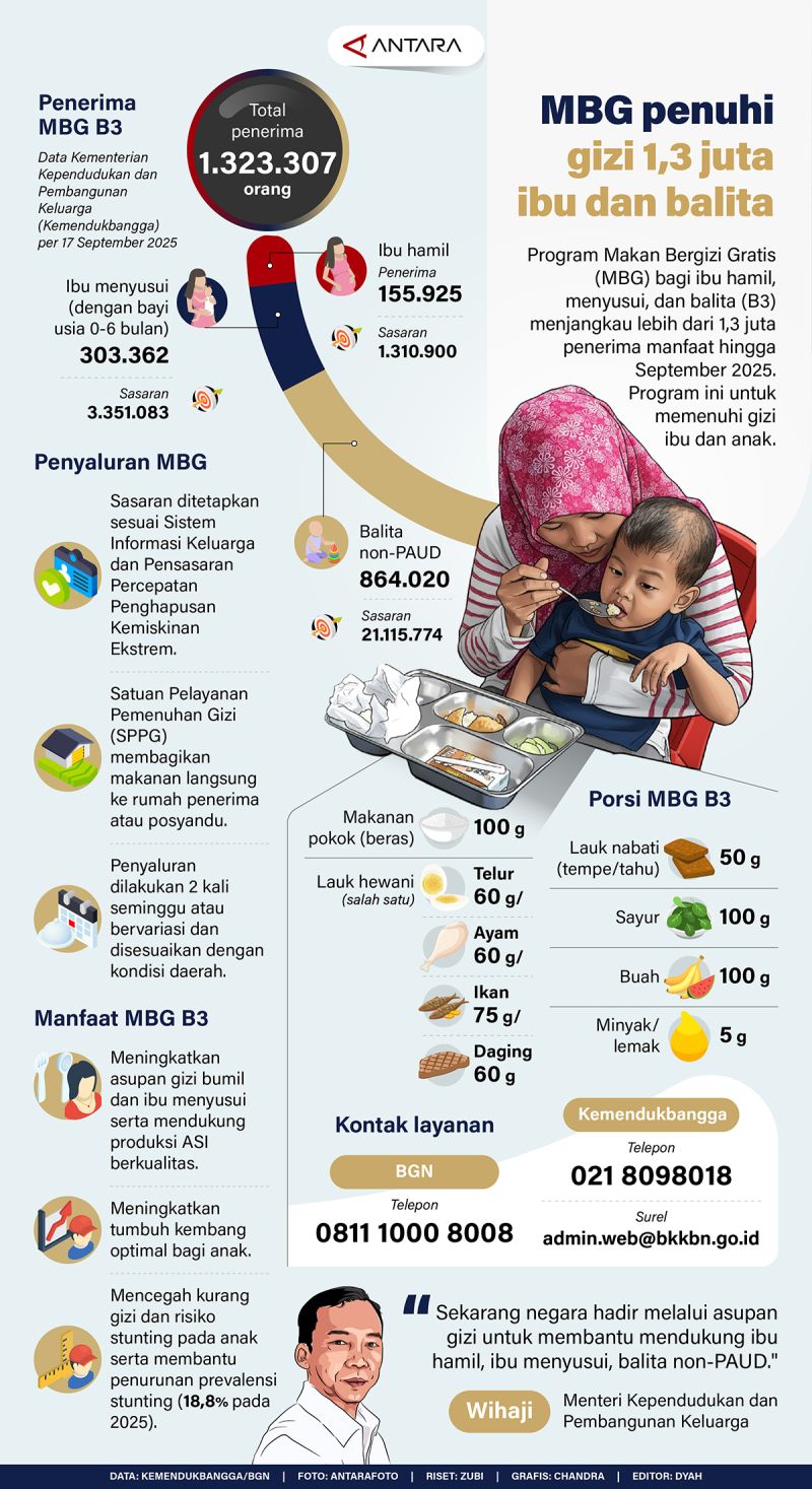 Program Makan Bergizi Gratis (MBG) bagi ibu hamil, menyusui, dan balita (B3) menjangkau lebih dari 1,3 juta penerima manfaat hingga September 2025. Program ini untuk memenuhi gizi ibu dan anak.