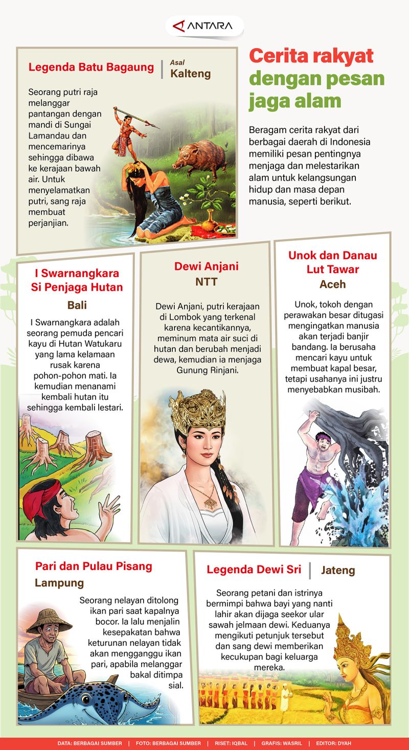 Beragam cerita rakyat dari berbagai daerah di Indonesia memiliki pesan pentingnya menjaga dan melestarikan alam untuk kelangsungan hidup dan masa depan manusia, seperti berikut.