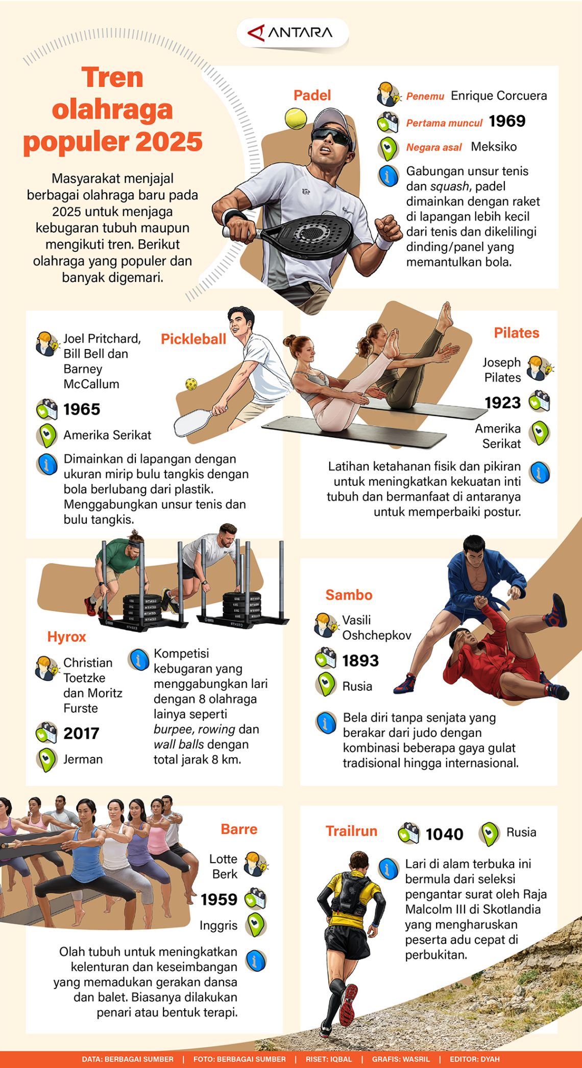 Masyarakat menjajal berbagai olahraga baru pada 2025 untuk menjaga kebugaran tubuh maupun mengikuti tren. Berikut olahraga yang populer dan banyak digemari.