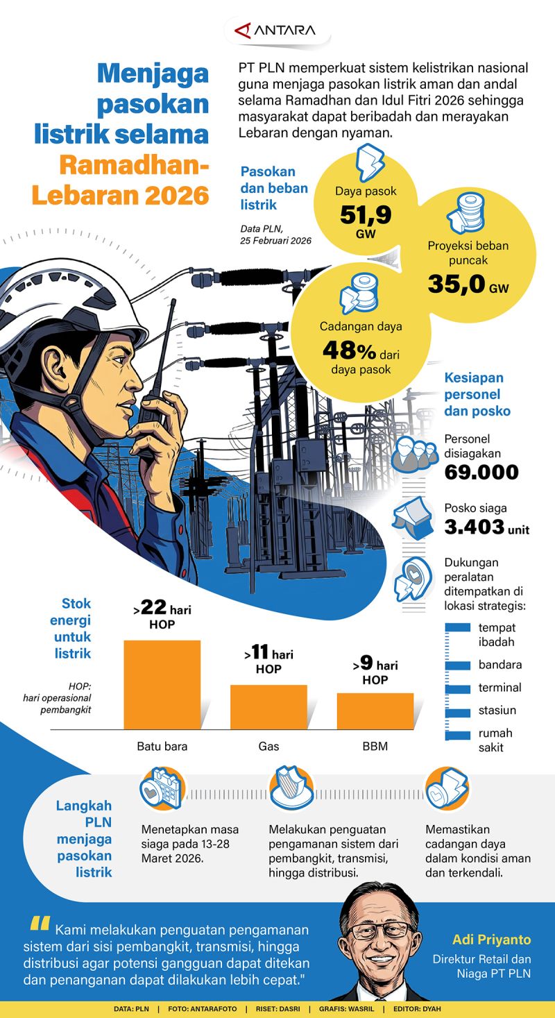 PT PLN memperkuat sistem kelistrikan nasional guna menjaga pasokan listrik aman dan andal selama Ramadhan dan Idul Fitri 2026 sehingga masyarakat dapat beribadah dan merayakan Lebaran dengan nyaman.
