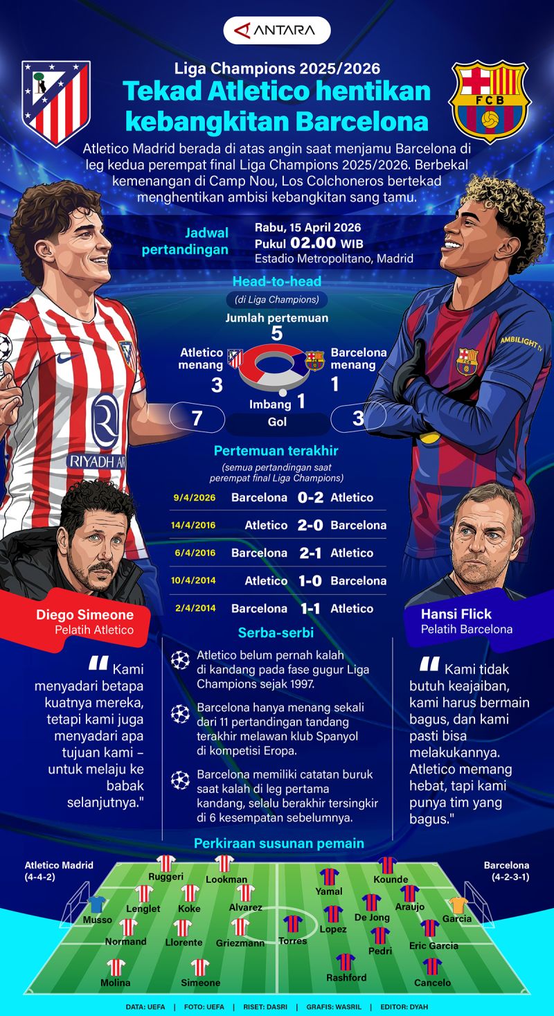 Atletico Madrid berada di atas angin saat menjamu Barcelona di leg kedua perempat final Liga Champions 2025/2026. Berbekal kemenangan di Camp Nou, Los Colchoneros bertekad menghentikan ambisi kebangkitan sang tamu.