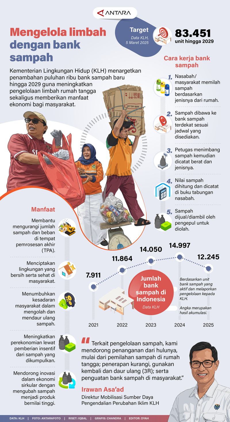 Kementerian Lingkungan Hidup (KLH) menargetkan penambahan puluhan ribu bank sampah baru hingga 2029 guna meningkatkan pengelolaan limbah rumah tangga sekaligus memberikan manfaat ekonomi bagi masyarakat.