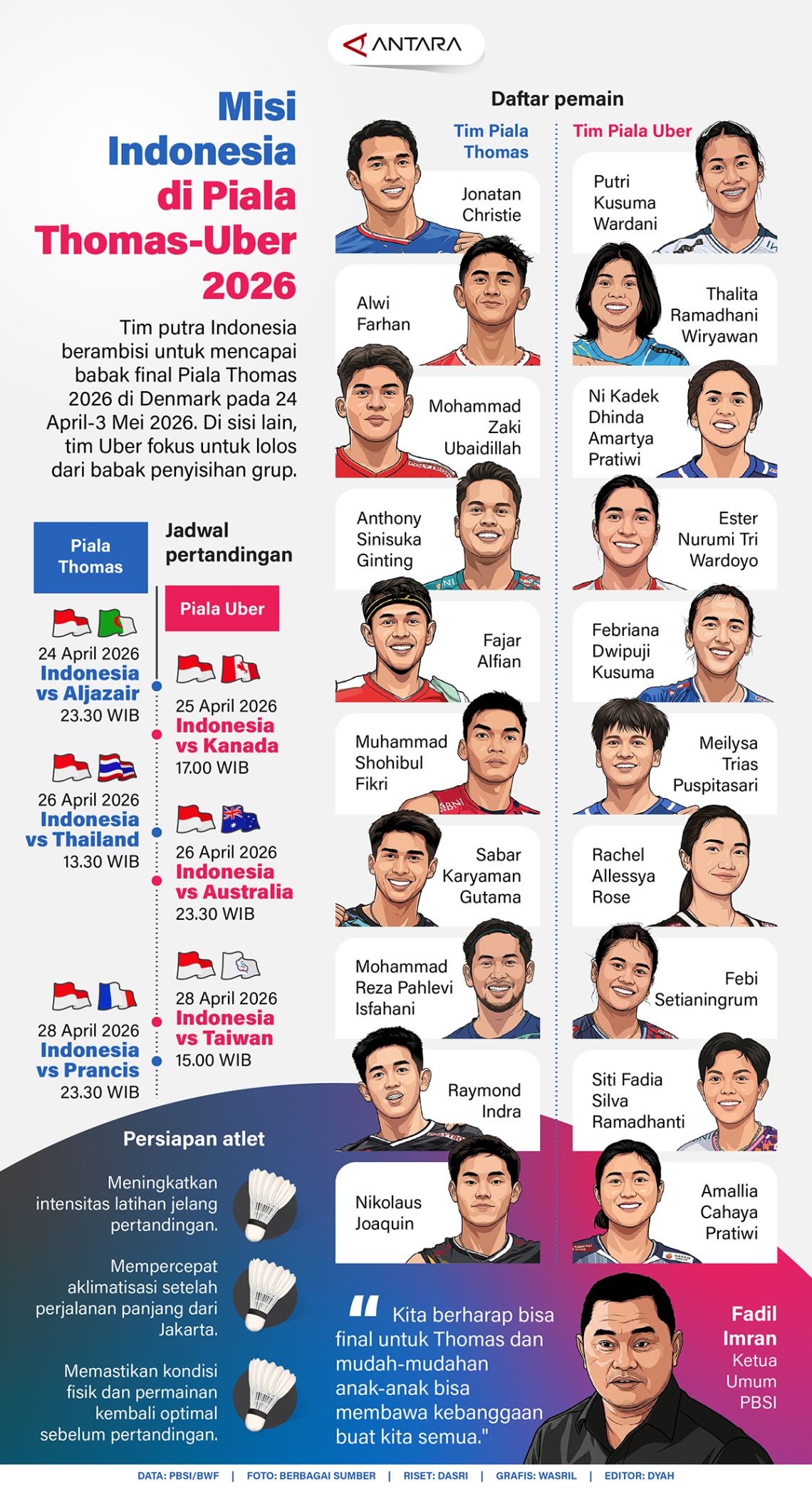 Tim putra Indonesia berambisi untuk mencapai babak final Piala Thomas 2026 di Denmark pada 24 April-3 Mei 2026. Di sisi lain, tim Uber fokus untuk lolos dari babak penyisihan grup.
