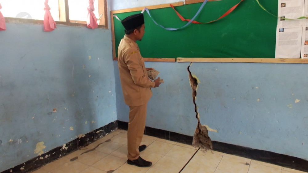 ANTARA - Akibat pergerakan tanah, sejumlah dinding dan lantai kelas SDN Langkap 02, Kecamatan Bangsalsari, Jember, Jawa Timur, mengalami retak-retak dan rawan ambruk. Kondisi tersebut menyebabkan puluhan siswa harus belajar di halaman musala sekolah. (Hamka Agung/Rayyan Thalib/Nusantara Mulkan)