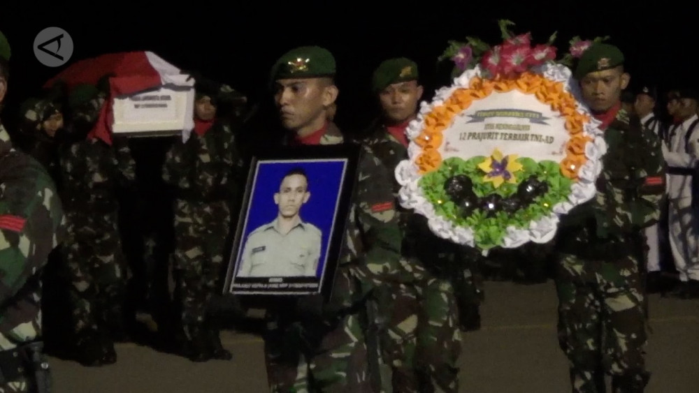 ANTARA - Praka Anumerta Risno, salah satu prajurit TNI yang gugur dalam kecelakaan Heli Mi-17 di Papua beberapa waktu lalu, tiba di Kota kendari, Selasa (18/2) malam di pangkalan TNI Angkatan Udara (Lanud) Haluoleo Kendari. Kedatangan jenazah disambut Pangdam XIV Hasanuddin Mayjen Andi Sumangerukka bersama jajaran Forkopimda Pemprov Sultra dengan upacara militer.(Saharudin/Chairul Fajri/Sizuka)