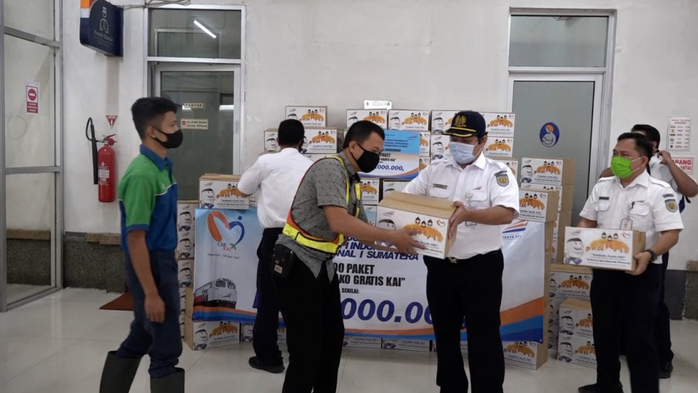 ANTARA - Untuk mewujudkan program BUMN Hadir Untuk Negeri, manajemen PT. Kereta Api Indonesia (KAI) Divre 1 Sumatera Utara membagikan ratusan paket sembako kepada pekerjanya dan warga di sekitar jalan rel Kota Medan dan Binjai, Sumatera Utara. Bantuan paket sembako telah dibagikan secara bertahap dalam beberapa hari terakhir, hingga menunggu kondisi terkini penanganan COVID-19. (Donny Aditra/Sandi Arizona/Perwiranta)