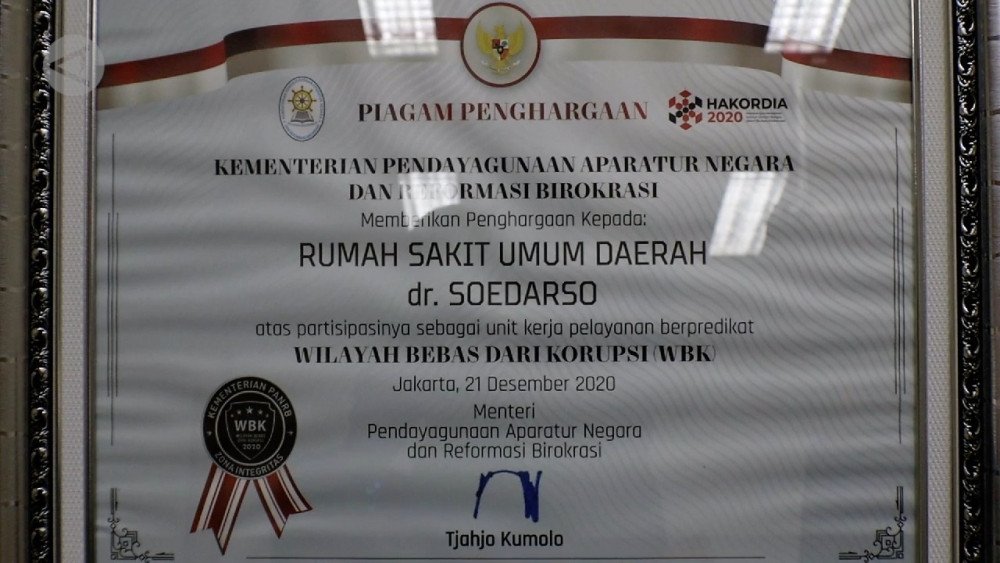 ANTARA - RSUD Dr. Soedarso Pontianak sebagai salah satu instansi pemerintah bidang pelayanan kesehatan di Provinsi Kalimantan Barat, berhasil meraih predikat Wilayah Bebas Korupsi (WBK) tahun 2020 dari Kementerian Pendayagunaan Aparatur Negara dan Reformasi Birokrasi (PANRB). Direktur Rumah Sakit Soedarso, Yuliastuti Saripawan, Rabu (23/12) mengungkapkan, penghargaan ini merupakan bentuk kesungguhan dalam melaksanakan pembangunan zona integritas, agar masyarakat di Kalbar bisa mendapatkan pelayanan yang lebih prima. (Indra Budi Santoso/Fahrul Marwansyah/Farah Khadija)