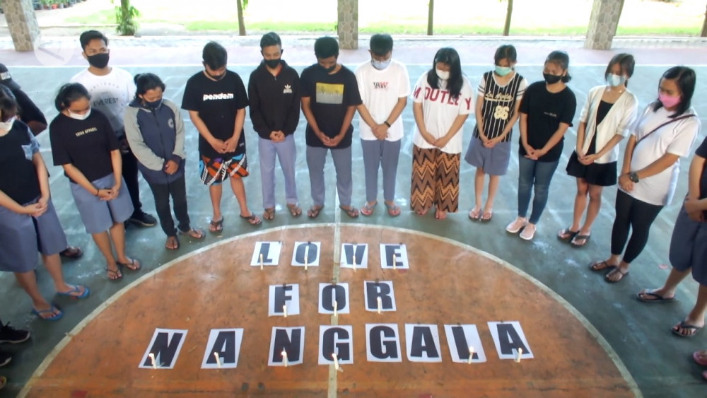 ANTARA - Pelajar Sekolah Menengah Atas (SMA) Katolik di Banyuwangi, Jawa Timur, Selasa (27/4) menggelar doa bersama untuk awak kapal KRI Nanggala-402 yang tenggelam di perairan utara Pulau Bali. Dalam doa bersama tersebut, para pelajar membawa poster dan tulisan cinta untuk Nanggala 402, serta menyalakan lilin sebagai bentuk rasa berbelasungkawa. (Hamka Agung Balya/Dudy Yanuwardhana/Rinto A Navis)