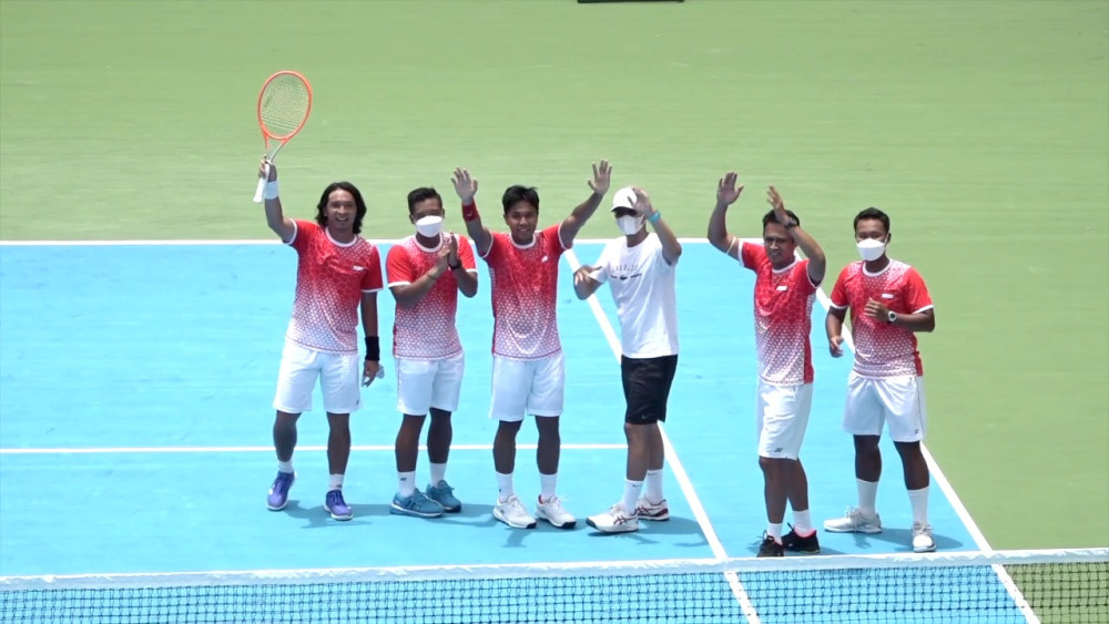 ANTARA- Indonesia unggul 3-0 atas Venezuela pada Playoff Grup II Davis Cup, Sabtu (5/3) yang memastikan Tim Merah Putih tetap bertahap pada World Grup II. Kemenangan tersebut sekaligus menjadi modal untuk bermain lebih baik dan tampil percaya diri jelang pertandingan Sea Game Hanoi, Vietnam, dan Asian Games Hangzhou, China. Di sisi lain, Davis Cup juga menjadi ajang unjuk gigi penampilan petenis muda yang dipersiapkan menjadi generasi penerus. (Erlangga Bregas Prakoso/Soni Namura/Risbeyhi)