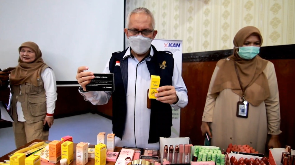 ANTARA - Balai Besar Pengawas Obat dan Makanan (BBPOM) di Padang, bersama Disperindag, Dinas Kesehatan dan Polda Sumbar, menertibkan 42 toko dan lapak penjualan kosmetik pada sejumlah daerah di Sumatera Barat. Hasilnya ditemukan 23 toko dan lapak yang menjual produk ilegal tanpa izin edar dari BPOM dengan nilai produk keseluruhan lebih dari Rp 31 juta.(Fandi Yogari Saputra/Rizky Bagus Dhermawan/Sizuka)