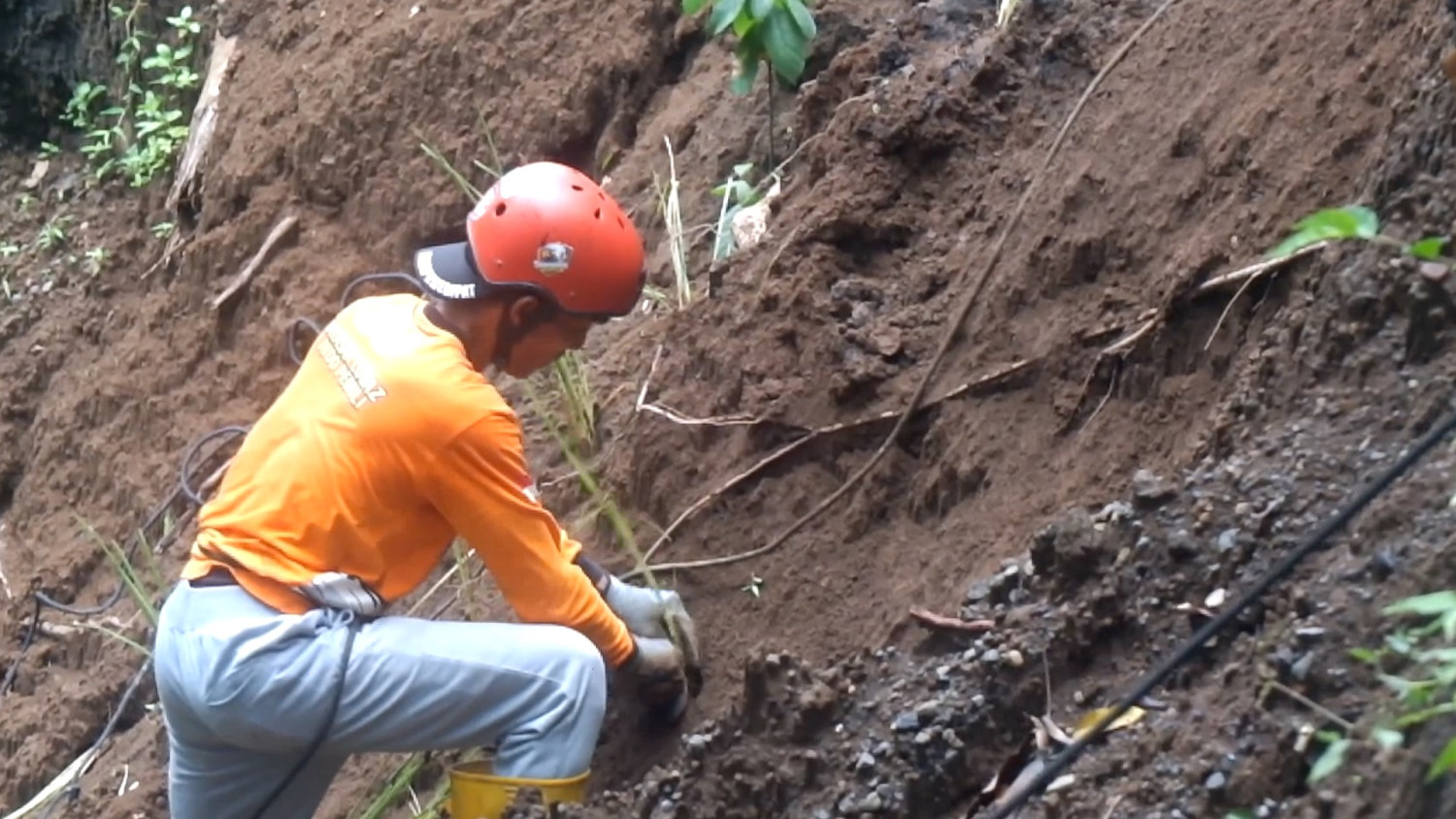 ANTARA - Tanah longsor di kawasan jalur Gunung Gumitir, Kecamatan Silo, Kabupaten Jember, Jawa Timur, kerap terjadi di saat musim penghujan hingga menyebabkan lumpuhnya akses jalan penghubung Kabupaten Jember dan Banyuwangi. Untuk mencegah hal itu, Badan Penanggulangan Bencana Daerah (BPBD) Jawa Timur bersama BPBD Jember, TNI, Polri dan para relawan melakukan penanaman rumput vetiver di tebing-tebing rawan longsor yang ada di sepanjang jalur tersebut, Senin (28/11).(Hamka Agung Balya/Yovita Amalia/Sizuka)