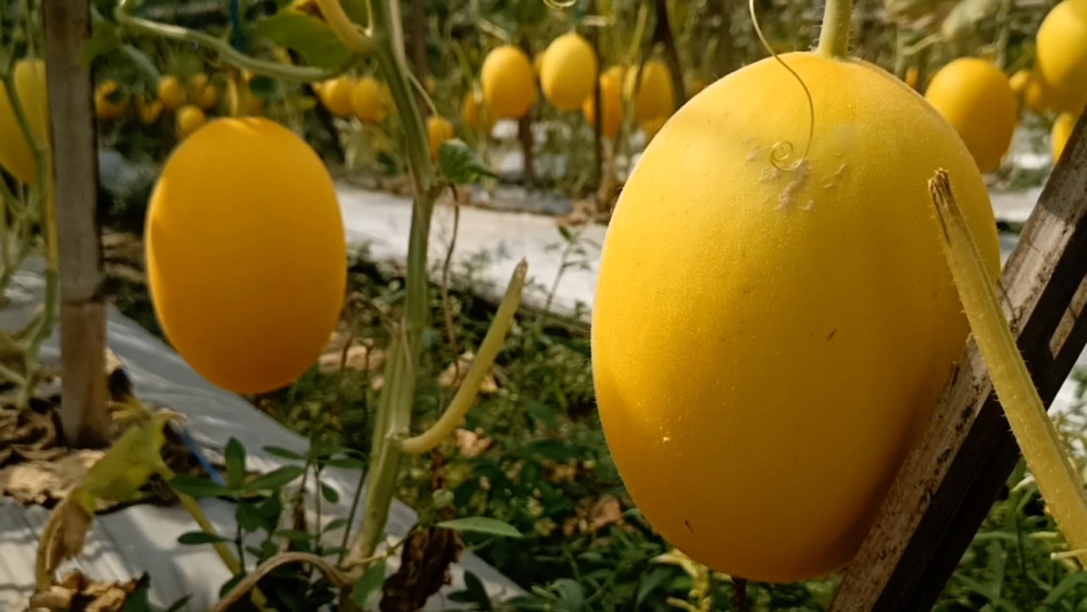 ANTARA - Sajim, seorang guru honor sukses membudidayakan melon golden bersama kelompok tani yang dibinanya di Kampung Karangjetak, Kelurahan Banjarnegara, Kecamatan Ciwandan, Kota Cilegon, Banten. Wakil Wali Kota Cilegon Sanuji Pentamarta pun ikut mendampinginya saat melakukan panen, Senin (5/12), dengan hasil sekitar seratus buah dengan berat 2,5 ton. (Susmiatun Hayati/Andi Bagasela/Nusantara Mulkan)