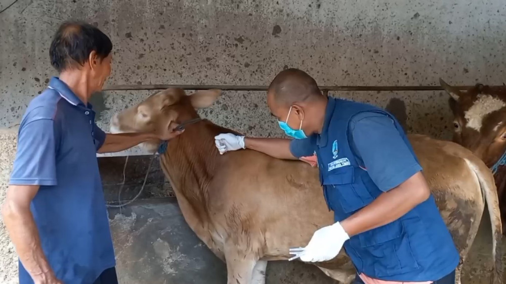 ANTARA - Guna mewaspadai virus Penyakit Mulut dan Kuku (PMK), Dinas Pertanian dan Perikanan Kabupaten Madiun melarang peternak mendatangkan hewan ternak dari luar, khususnya wilayah yang terdeteksi kasus PMK. Selain itu mereka juga mengerahkan sejumlah petugas untuk memberi suntikan vaksinasi PMK ke hewan ternak, Rabu (1/2). (Rindhu Dwi Kartiko/Rizky Bagus Dhermawan/Rully Yuliardi Achmad)