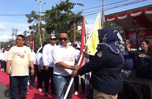 ANTARA - Ketua Komisi Pemilihan Umum (KPU) Kota Gorontalo Sukrin Saleh Taib menerima bendera Kirab Pemilu 2024 yang dibawa oleh rombongan KPU Sulawesi Utara melalui jalur darat di Kota Gorontalo, Provinsi Gorontalo, Minggu (30/4). Bendera Kirab Pemilu akan berada di Kota Gorontalo dari tanggal 30 April hingga 3 Mei dalam rangka sosialisasi tahapan penyelenggaraan Pemilu 2024 dengan alokasi kursi dan Dapil di Kota Gorontalo. (Adiwinata Solihin/Rizky Bagus Dhermawan/Gracia Simanjuntak)