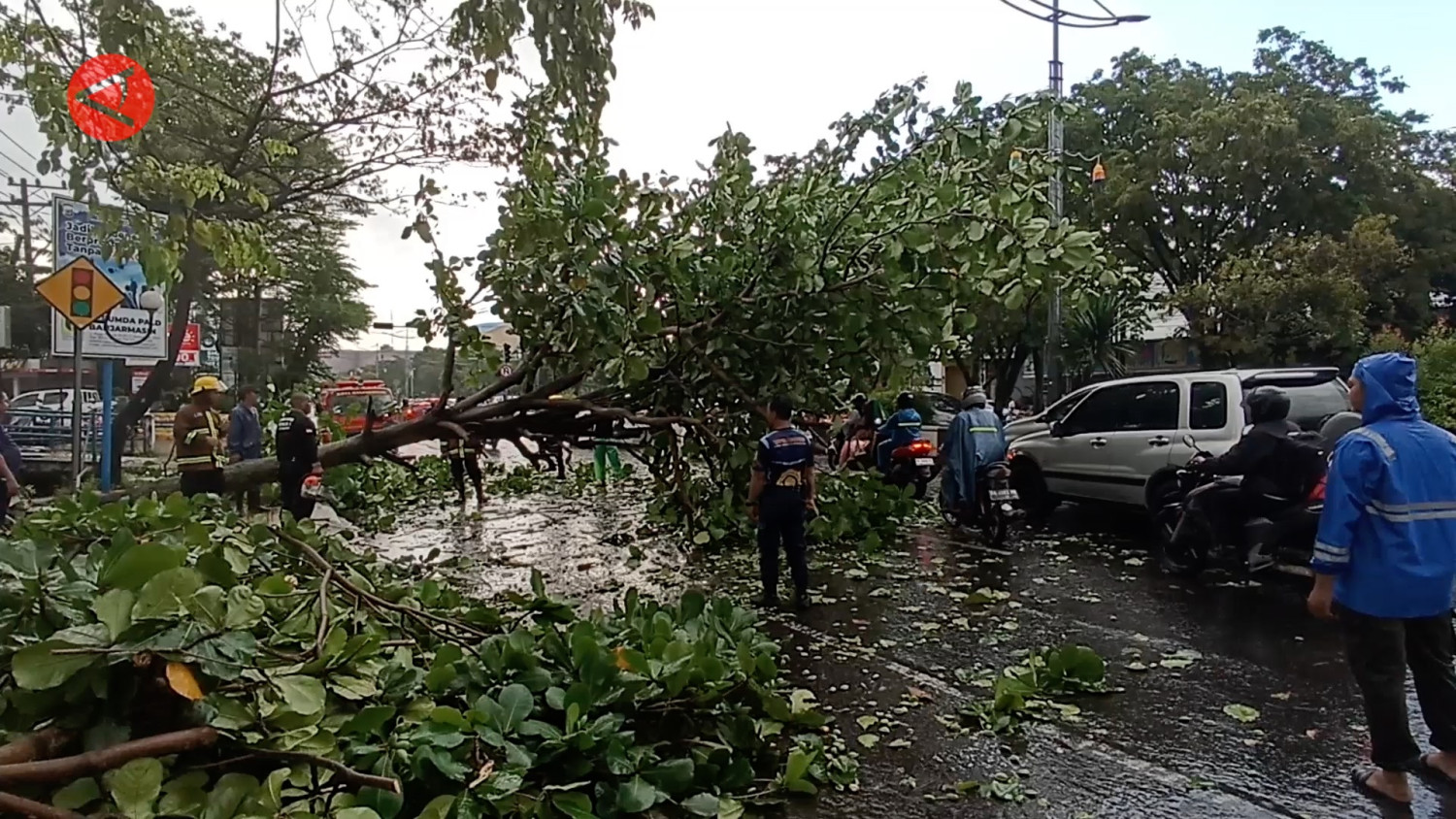 ANTARA - Hujan lebat disertai angin kencang mengakibatkan pohon tumbang di beberapa titik jalan utama Kota Banjarmasin sehingga menyebabkan kemacetan panjang di akses jalan utama menuju arah dalam kota tersebut, pada kejadian ini dilaporkan Satu orang meninggal dunia dan satu mobil ringsek akibat tertimpa pohon. (Latif Thohir/Sandy Arizona/Hilary Pasulu)