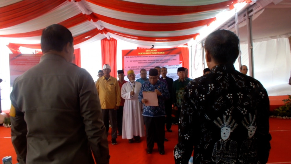 ANTARA - Jelang pelaksanaan Pemilu 2024, Kepolisian Daerah Bangka Belitung menggelar deklarasi pemilu damai di Pangkalpinang pada Sabtu (28/10). Kegiatan tersebut mengundang berbagi unsur elemen masyarakat untuk berpartisipasi mewujudkan suksesnya Pemilu 2024 di Provinsi Kepulauan Bangka Belitung. (Chandrika Purnama Dewi/Chairul Fajri/Saras Krisvianti)