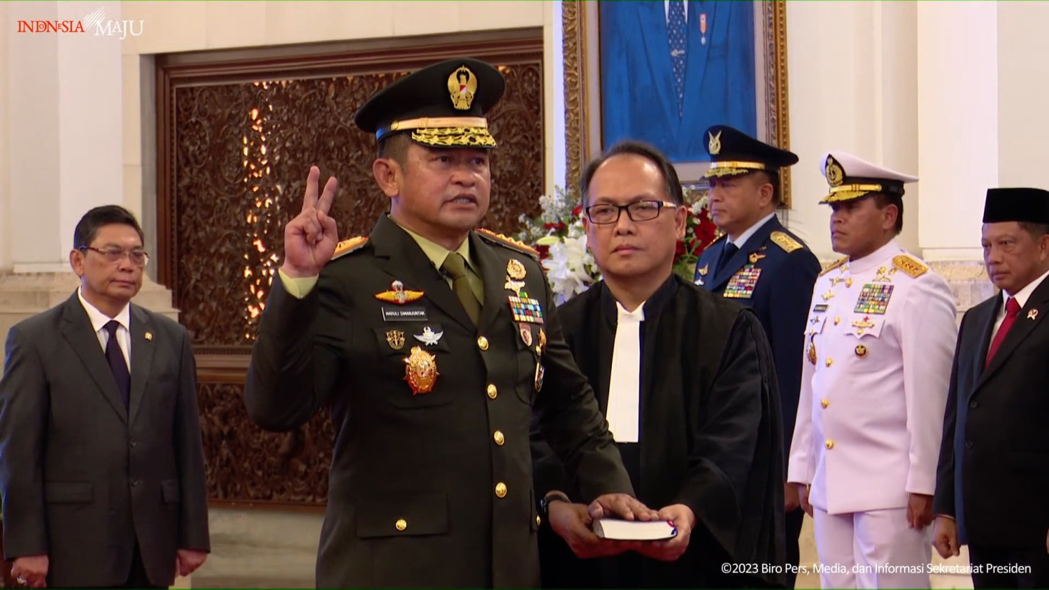 ANTARA - Presiden Joko Widodo melantik Letnan Jenderal TNI Maruli Simanjuntak sebagai Kepala Staf TNI Angkatan Darat (KSAD) menggantikan Jenderal TNI Agus Subiyanto di Istana Negara, Jakarta, Rabu (29/11). Salah satu program yang akan dikerjakan selama menjadi KSAD, menurut Maruli, adalah mengatasi konflik di Papua melalui taktik perang gerilya. (Afra Augesti/Pradanna Tampi/Yovita Amalia/Nusantara Mulkan)