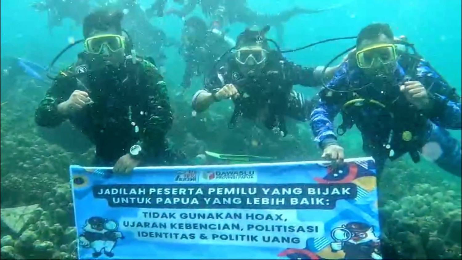 ANTARA - Personel gabungan TNI-Polri bersama Bawaslu dan KPU Provinsi Papua menggelar deklarasi "Netralitas Pemilu Damai" di dasar Laut Teluk Yos Sudarso Dok II, Kota Jayapura, Papua, Selasa (12/12). Deklarasi tersebut sebagai bentuk komitmen TNI-Polri dalam mewujudkan pemilu serentak 2024 yang aman dan damai di Bumi Cenderawasih.(Laksa Mahendra/Yovita Amalia/Ludmila Yusufin Diah Nastiti)