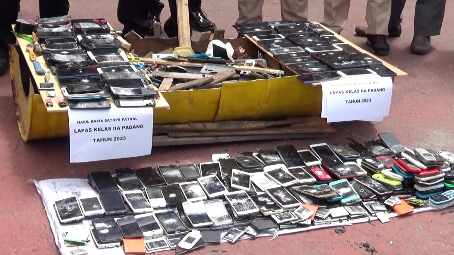 ANTARA - Lembaga Pemasyarakatan Kelas II A Muaro Kota Padang, Sumatera Barat memusnahkan sebanyak 532 unit telepon genggam dan sejumlah senjata tajam hasil razia terhadap Warga Binaan Pemasyarakatan (WBP) sepanjang tahun 2023 pada Sabtu (30/12). Untuk memperketat pengawasan dan penyusupan alat komunikasi terhadap WBP, Lapas Muaro sedang mengembangkan aplikasi kode batang guna mendata telepon genggam yang digunakan petugas di dalam Lapas. (Melani Friati/Satrio Giri Marwanto/Farah Khadija)