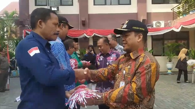ANTARA - Pemerintah Kota Tangerang, Banten membagikan 1.000 bendera Merah Putih kepada masyarakat di Kecamatan Ciledug, Kamis (1/8). Kegiatan ini dilakukan dalam rangka menggelorakan semangat kemerdekaan di tengah masyarakat.(Agung Andhika Indrawan/Rizky Bagus Dhermawan/Ludmila Yusufin Diah Nastiti)