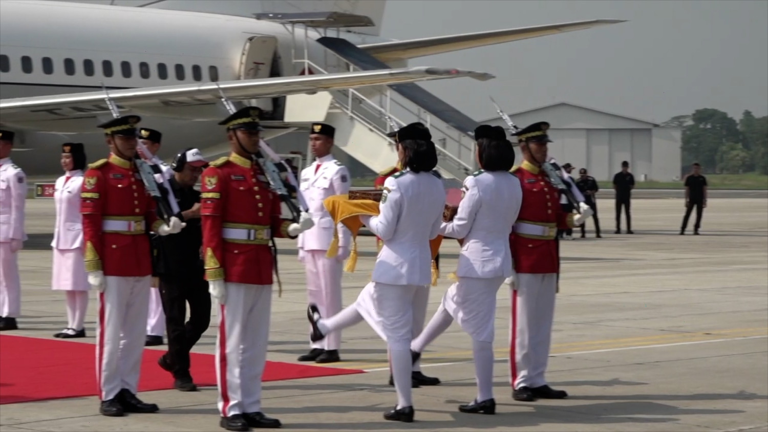 ANTARA - Duplikat bendera pusaka dan teks proklamasi yang dibawa oleh pasukan Paskibra dari Monas telah diterbangkan dari Bandara Halim Perdanakusuma menuju ke Ibu Kota Nusantara, Sabtu (10/8). Naskah dan bendera itu diantar dan diterbangkan menggunakan pesawat Boeing-737 milik TNI Angkatan Udara (AU) sekira pukul 10.00 WIB. (Azhfar Muhammad Robbani/Roy Rosa Bachtiar/Yovita Amalia/Nanien Yuniar)