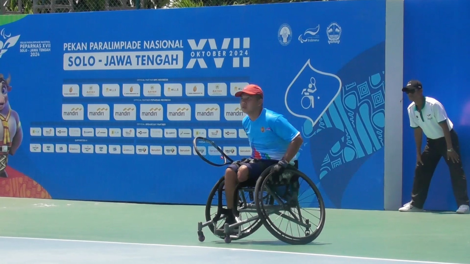 ANTARA - Petenis kursi roda dari kontingen D.I. Yogyakarta, Kevin Sanjaya berhasil menyabet emas pada Pekan Paralimpiade Nasional (Peparnas) XVII Solo, Jawa Tengah. di partai final, ia berhasil mengalahkan petenis dari kontingen Papua Agus Fitriadi dengan merebut kemenangan sempurna 2-0. (Fx. Suryo Wicaksono/Soni Namura/Rinto A Navis)