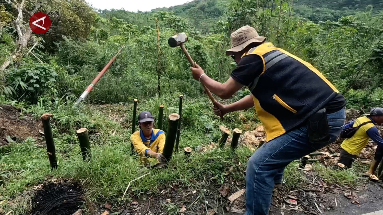 ANTARA - Ratusan batang bambu dipasang di Jalan Baros-Sagaranten di Desa Cijangkar, Kecamatan Nyalindung, Kabupaten Sukabumi, Jawa Barat pada Rabu (11/12). Pemasangan ratusan batang bambu dilakukan UPTD Pengelolaan Jalan dan Jembatan Wilayah Pelayanan II Sukabumi sebagai penahan supaya tidak terjadi longsor susulan. (Fadzar Ilham Pangestu/Sandy Arizona/Rijalul Vikry)