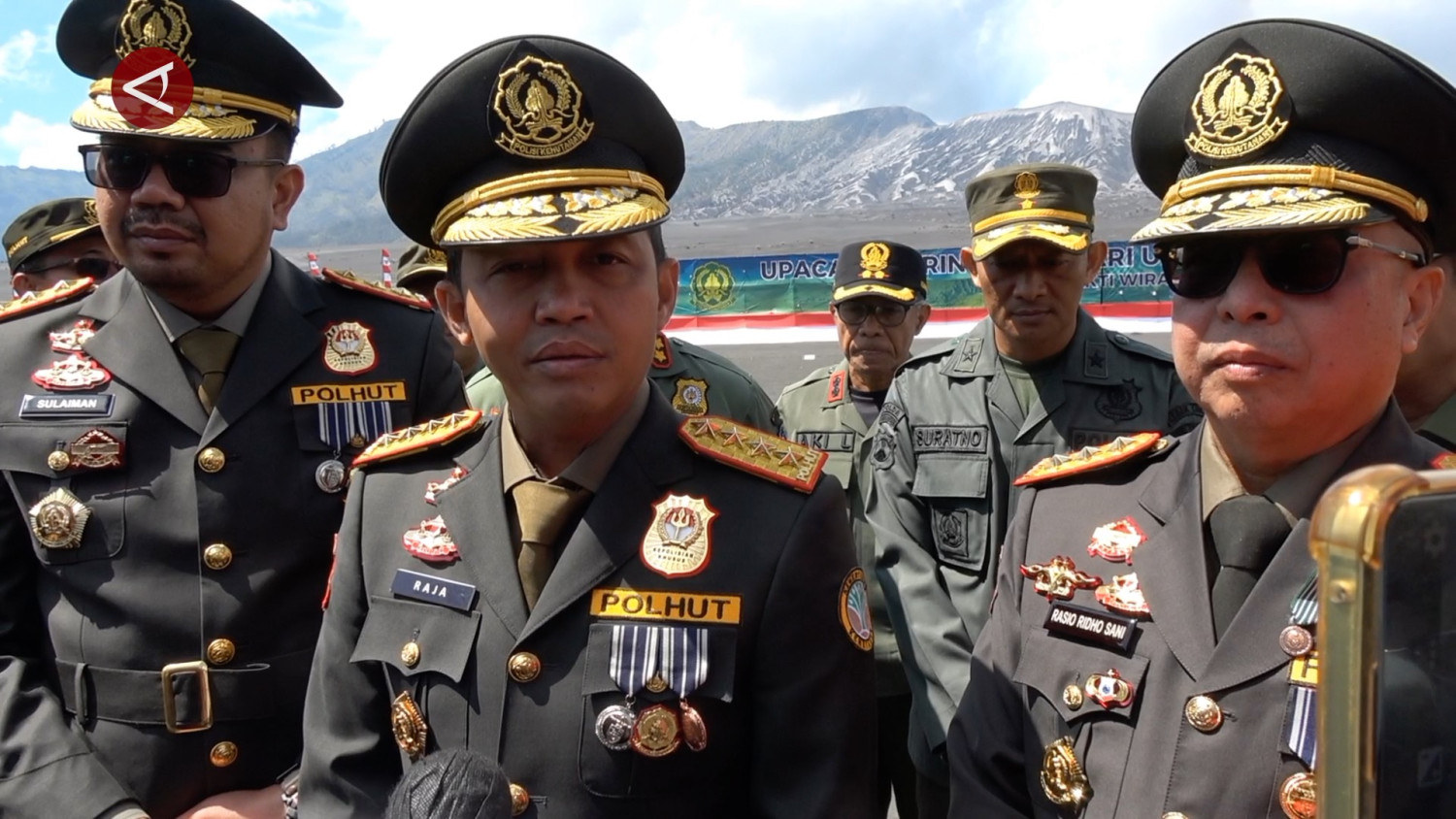 ANTARA - Hingga saat ini masih marak terjadi penebangan hutan secara liar, perdagangan ilegal satwa dan hewan yang dilindungi. Terkait hal tersebut Kementerian Kehutanan bersiap menertibkan kawasan hutan dan menindak tegas para pelaku. Hal ini disampaikan Menteri Kehutanan Raja Juli Antoni dalam upacara Peringatan HUT ke-58 Polisi Kehutanan di lautan pasir Gunung Bromo Kabupaten Probolinggo, Selasa (24/12). (Achmad Syaiful Afandi/Rayyan/Ardi Irawan)