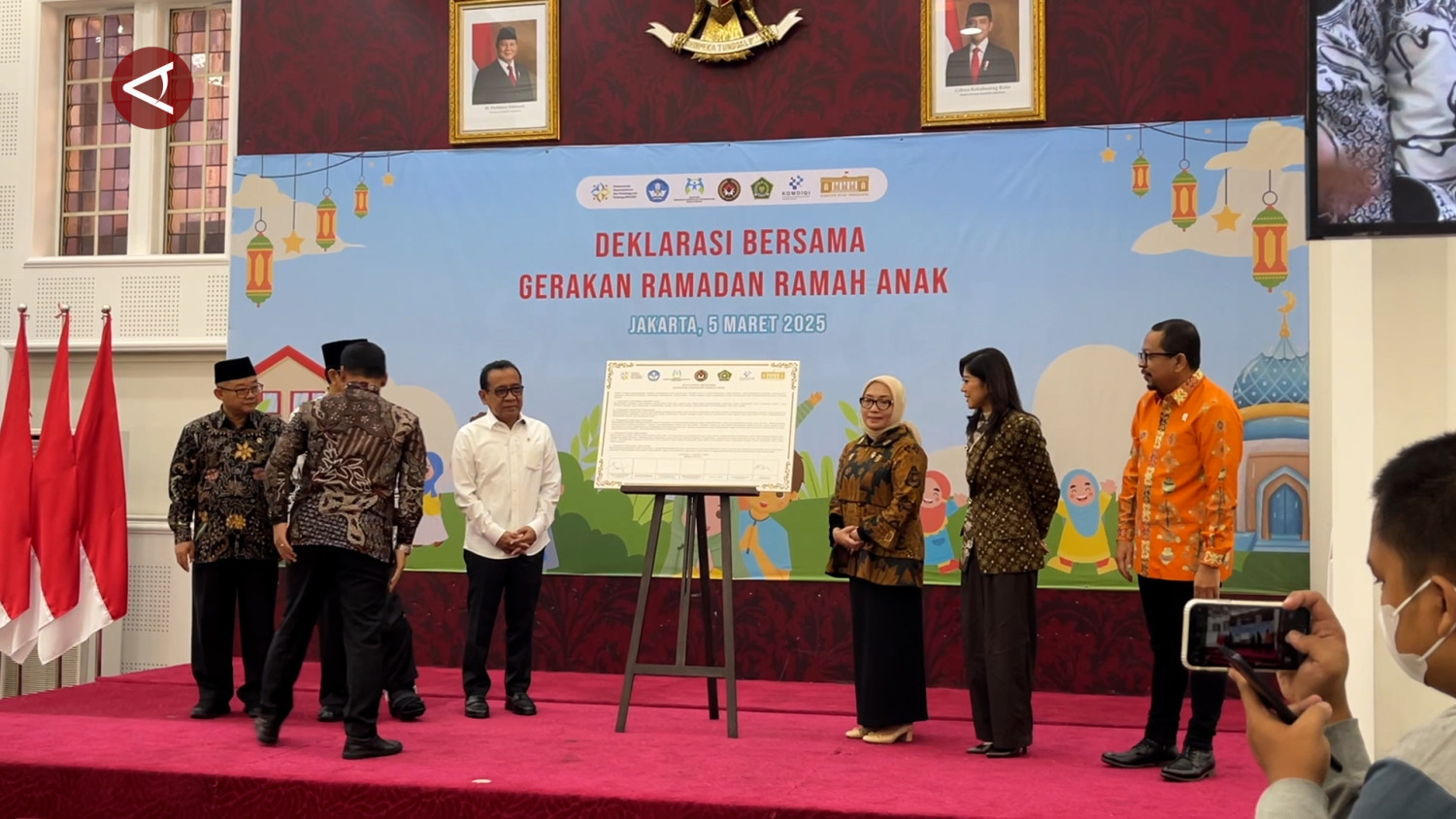 ANTARA - Deklarasi Bersama Gerakan Ramah Anak ditandatangani oleh sejumlah menteri di Jakarta, Rabu (5/4). Gerakan yang diinisiasi oleh Kementerian Pemberdayaan Perempuan dan Perlindungan Anak (PPPA) ini, mengajak masyarakat meningkatkan kualitas pemenuhan hak pengasuhan anak melalui gerakan satu jam bersama keluarga tanpa penggunaan gawai. (Setyanka Harviana Putri/Arif Prada/Rinto A Navis)