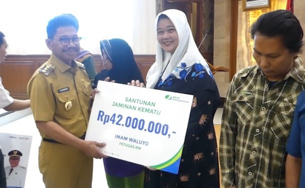 ANTARA - Pemerintah Kota Tangerang dan BPJS Ketenagakerjaan menyerahkan santunan kepada 5.952 warga Kota Tangerang, Senin (24/3). Warga yang mendapatkan santunan adalah pekerja rentan yang berhak atas Jaminan Kematian (JKM) dan Jaminan Kecelakaan kerja (JKK). Dana jaminan yang disalurkan bersumber dari iuran kepesertaan BPJS Ketenagakerjaan yang ditanggung oleh Pemkot Tangerang. (Agung Andhika Indrawan/Rizky Bagus Dhermawan/Rinto A Navis)