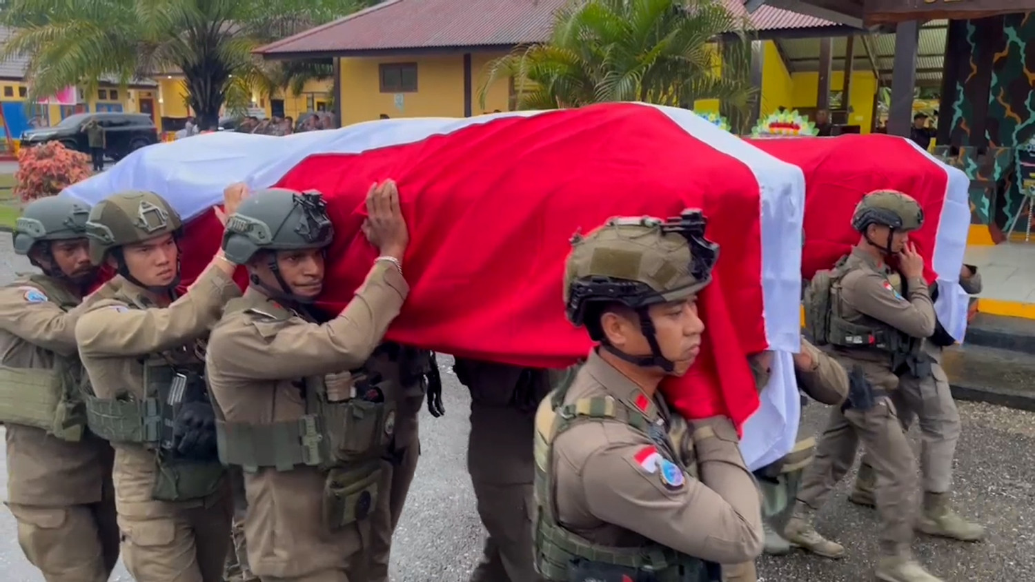 ANTARA - Upacara militer iringi pemberangkatan dua jenazah personel Brimob Satgas Damai Cartenz ke Serui, Kepulauan Yapen di Mako Brimob Batalyon B Mimika, Sabtu (17/5). Keduanya merupakan korban penembakan kelompok kriminal bersenjata (KKB) di Puncak Jaya akan dimakamkan di Serui Kepulauan Yapen, Papua, pada Kamis (15/5).(Laksa Mahendra/Arif Prada/Ludmila Yusufin Diah Nastiti)