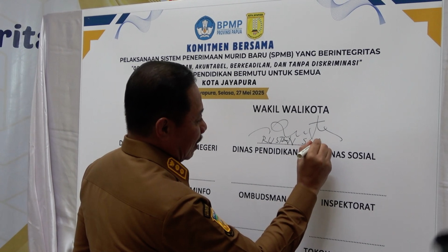 ANTARA - Demi pelaksanaan Sistem Penerimaan Murid Baru (SPMB) di Kota Jayapura berjalan baik tanpa diskriminasi, Balai Penjaminan Mutu Pendidikan (BPMP) Papua dan Pemerintah Kota Jayapura melakukan penandatangan komitmen bersama dan Pakta Integritas. Kegiatan ini merupakan upaya pemerintah Kota Jayapura mencegah pungutan liar dan jalur titipan sepanjang proses SPMB 2025 yang dilakukan di seluruh tingkatan sekolah negeri. (Laksa Mahendra/Andi Bagasela/Rinto A Navis)