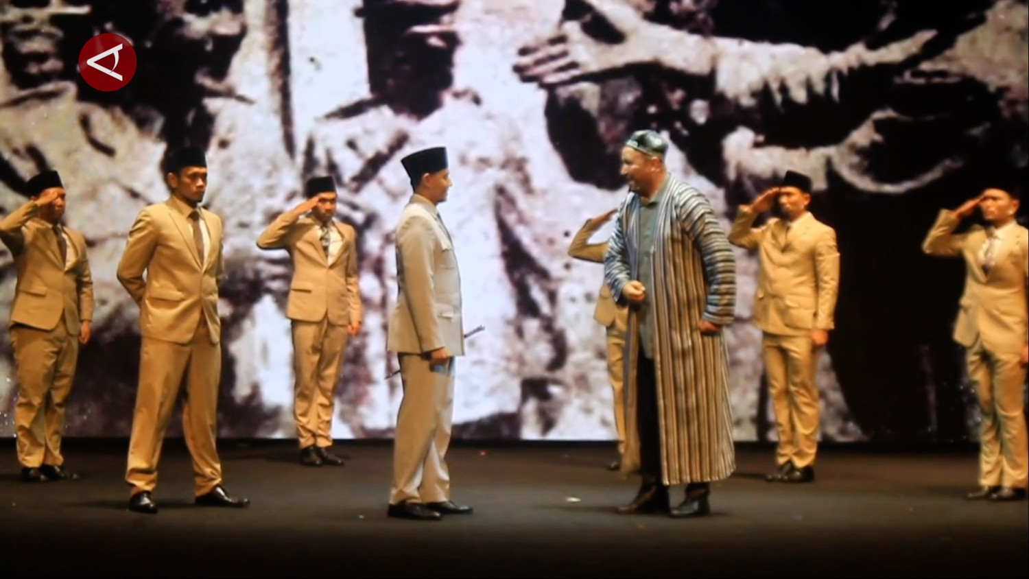 ANTARA - Seniman Indonesia dan Uzbekistan berkolaborasi memproduksi pertunjukan teater yang mengangkat lakon "Imam Al-Bukhari dan Soekarno" di Kota Surabaya, Jawa Timur, Jumat (27/6). Disutradarai oleh Ahmad Fauzi dan Valikhon Umarov, pertunjukan ini mengangkat kisah kunjungan kenegaraan Presiden Soekarno ke Uni Soviet pada tahun 1956. (Hanif Nasrullah/Sandy Arizona/Rijalul Vikry)