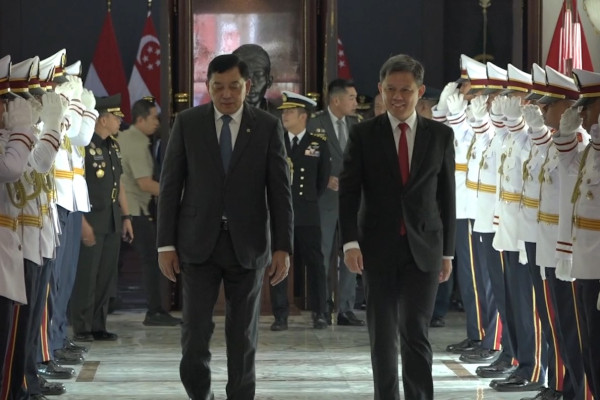 ANTARA - Menteri Pertahanan Republik Indonesia Sjafrie Sjamsoeddin, menerima kunjungan Menteri Pertahanan Singapura Chan Chun Sing, di Kantor Kementerian Pertahanan, Jakarta, Selasa (5/8). Pertemuan kedua menhan itu bertujuan untuk membahas kerangka mempererat hubungan bilateral di bidang pertahanan antara Indonesia dan Singapura. (Anggah/Rizky Bagus Dhermawan/Roy Rosa Bachtiar)