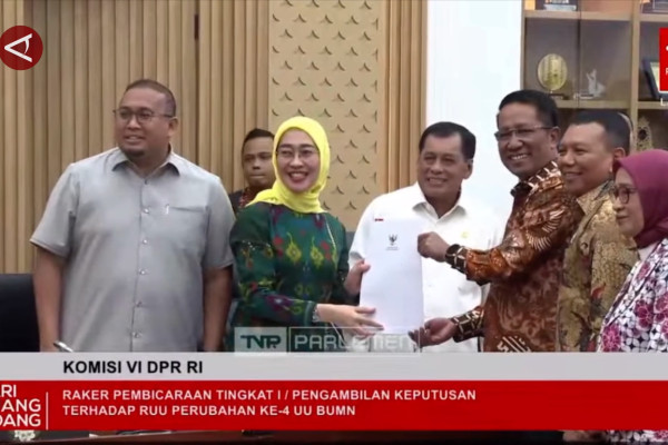 ANTARA - DPR bersama pemerintah menyetujui RUU Perubahan Keempat atas UU Nomor 19 Tahun 2003 tentang BUMN, untuk dibawa ke pembahasan tingkat II atau paripurna di Jakarta, Jumat (26/9). Revisi ini mencakup 84 pasal yang mengatur tata kelola baru dan penguatan peran BUMN. (Putri Hanifa/Agha Yuninda Maulana/Roy Rosa Bachtiar)
