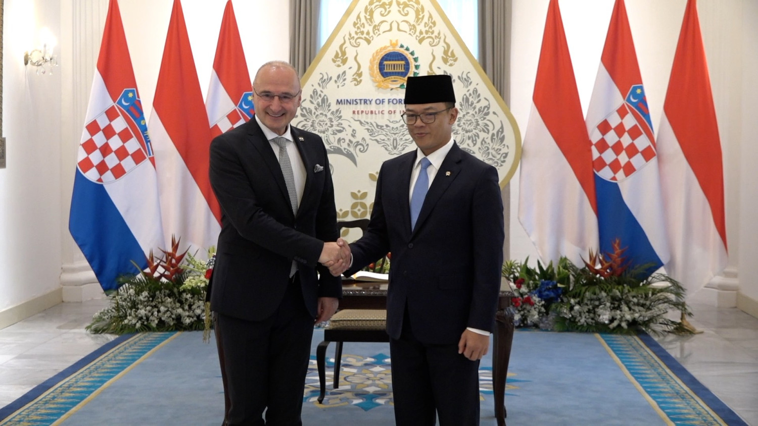 ANTARA - Menteri Luar Negeri RI Sugiono melakukan pertemuan bilateral dengan Menteri Luar Negeri Kroasia Gordan Grlić Radman di Kantor Kementerian Luar Negeri Jakarta, Senin (10/11). Usai pertemuan tersebut, Menlu RI Sugiono mengatakan keduanya membahas penguatan kerja sama antara Indonesia dan Kroasia di berbagai sektor, termasuk ekonomi dan keamanan. (Sanya Dinda Susanti/Yovita Amalia/Gracia Simanjuntak)