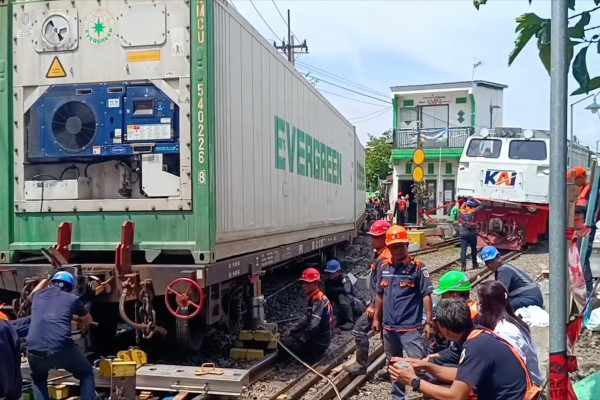ANTARA - Kereta Api (KA) Barang Aksa Cargo relasi Kalimas - Tanjung Priok anjlok di Surabaya, Jawa Timur, Rabu (19/11). Insiden tersebut berdampak pada gangguan operasional sejumlah perjalanan kereta api Daop VIII Surabaya, sehingga mengalami keterlambatan tiba di tujuan. (Hanif Nasrullah/Yovita Amalia/Ludmila Yusufin Diah Nastiti)