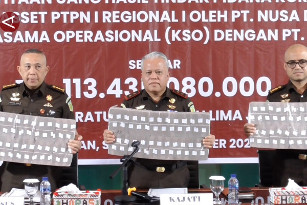 ANTARA - Kejaksaan Tinggi (Kejati) Sumatera Utara (Sumut) menerima pengembalian uang kerugian penjualan aset PTPN I Regional I sebesar Rp113.435.080 dari PT NDP. Dengan demikian dalam kasus tersebut, Kepala Kejati Sumut mengungkapkan jumlah pengembalian kerugian keuangan negara yang telah diterima pihaknya sebesar Rp263.435.080. (M. Valery Maulidzar S/Arif Prada/Gracia Simanjuntak)